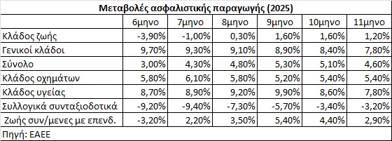 Δεν είναι τυχαίο ότι στο ενδεκάμηνο του 2025 (στοιχεία από έρευνα της Ένωσης Ασφαλιστικών Εταιρειών Ελλάδος) η παραγωγή των γενικών κλάδων αυξήθηκε κατά 7,8%, όταν το σύνολο της παραγωγής έτρεξε μόλις κατά 4,6% (στο +1,2% τα ζωικά προϊόντα).