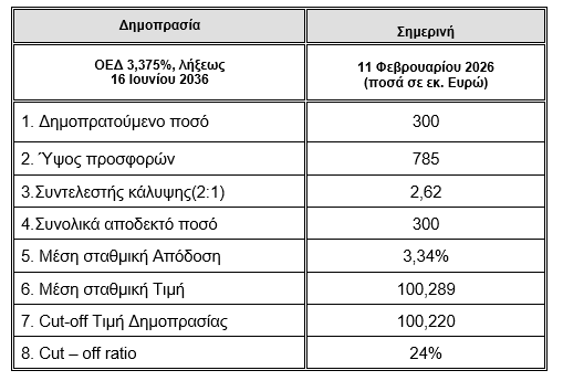Οι συνολικές προσφορές ανήλθαν σε 785 εκατ. ευρώ και η ημερομηνία διακανονισμού είναι η Τετάρτη 18 Φεβρουαρίου 2026.