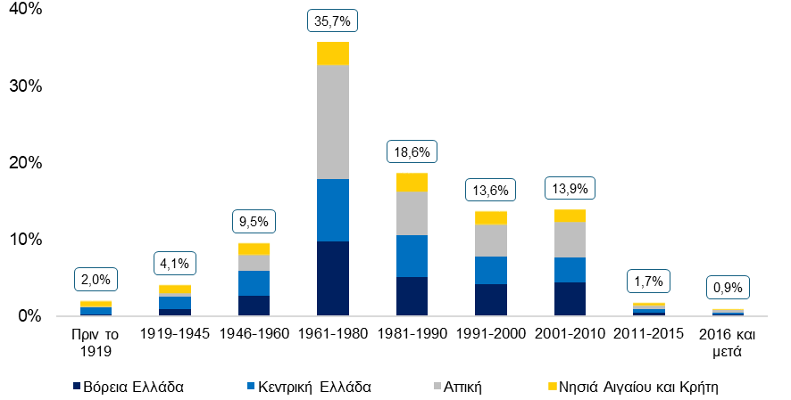 Μια πιθανή εξήγηση σχετίζεται με την ηλικία του αποθέματος των κατοικιών της χώρας. Όπως παρατηρείται στο Γράφημα 1, το 64% του οικιστικού αποθέματος στην Ελλάδα κατασκευάστηκε μεταξύ του Β' Παγκοσμίου Πολέμου και του 1990, ενώ άλλο ένα 6% είχε κατασκευαστεί πριν από τον πόλεμο. Επιπλέον, μόνο το 2,6% του υφιστάμενου αποθέματος κατοικιών κατασκευάστηκε από την έναρξη της οικονομικής κρίσης μέχρι σήμερα, γεγονός που οφείλεται σε σημαντικό βαθμό στην απότομη πτώση της κατασκευαστικής δραστηριότητας κατά την περίοδο αυτή.