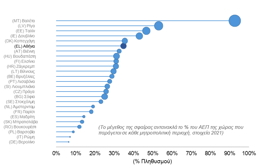 Το Γράφημα 3 απεικονίζει το ποσοστό του πληθυσμού που κατοικεί στις πρωτεύουσες της ΕΕ και τις μητροπολιτικές περιοχές τους, καθώς και το μερίδιο του ΑΕΠ της αντίστοιχης περιοχής. Η Αθήνα είναι μεταξύ των πρωτευουσών με τα υψηλότερα ποσοστά με βάση τα δύο κριτήρια. Συγκεκριμένα, το 35% του πληθυσμού της χώρας ζει στη μητροπολιτική περιοχή της πρωτεύουσας.
