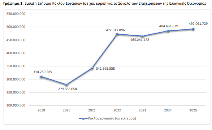 Για το σύνολο των επιχειρήσεων και των δραστηριοτήτων της οικονομίας, ο κύκλος εργασιών το έτος 2025 ανήλθε σε 492.061.729 χιλ. ευρώ, σημειώνοντας αύξηση 1,6% σε σχέση με το έτος 2024, που είχε ανέλθει σε 484.461.029 χιλ. ευρώ.