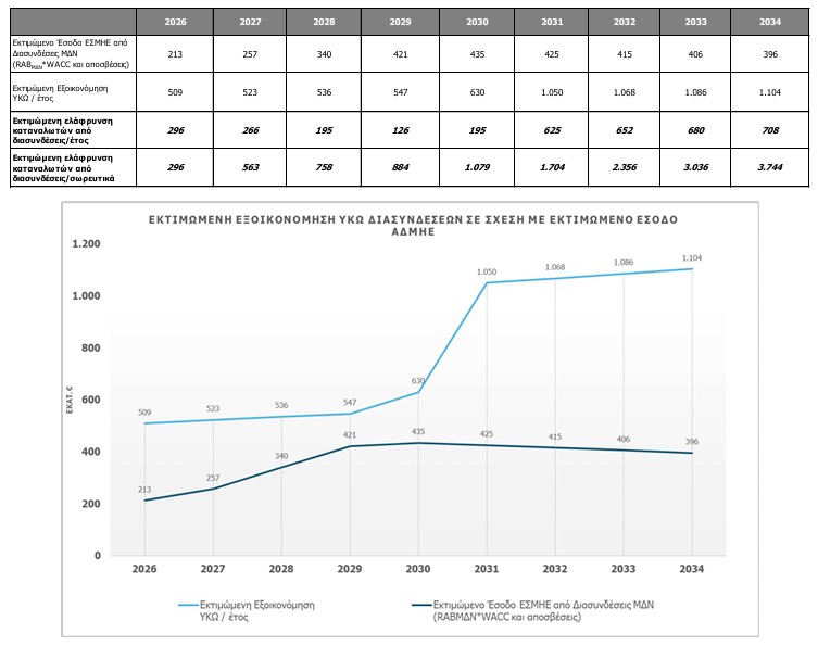 Σύμφωνα με την ανάλυση του ΑΔΜΗΕ η εκτιμώμενη εξοικονόμηση των ΥΚΩ λόγω των διασυνδέσεων θα είναι 523 εκατ. ευρώ το 2027, 536 εκατ. το 2028, 547 εκατ. το 2029 και 630 εκατ το 2030. Από τη στιγμή που θα ηλεκτριστούν όλες οι διασυνδέσεις, (των Δωδεκανήσων και του ΒΑ Αιγαίου), εκτιμά ότι τα παραπάνω ποσά θα πολλαπλασιαστούν και θα διαμορφωθούν σε 1,05 δισ το 2031, 1,07 δισ (2032), 1,08 δισ (2033) και 1,1 δισ (2034).