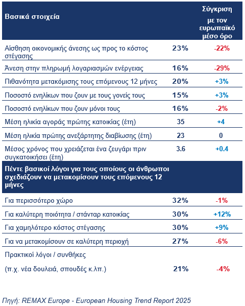 Ωστόσο, περίπου ένας στους τρεις Έλληνες (27%) δυσκολεύεται να ανταποκριθεί στο κόστος της τωρινής του κατοικίας, έναντι 17% στο σύνολο των Ευρωπαίων, ενώ ακόμα περισσότεροι Έλληνες (34%) αντιμετωπίζουν δυσκολίες για τους λογαριασμούς ενέργειας (στην Ευρώπη το ποσοστό είναι 16%). Επίσης, περίπου ένας στους δέκα (11%) ξοδεύει πάνω από το 50% του εισοδήματός του σε στέγαση και λογαριασμούς, κάτι που επηρεάζει αρνητικά τα επίπεδα στεγαστικής ικανοποίησης.