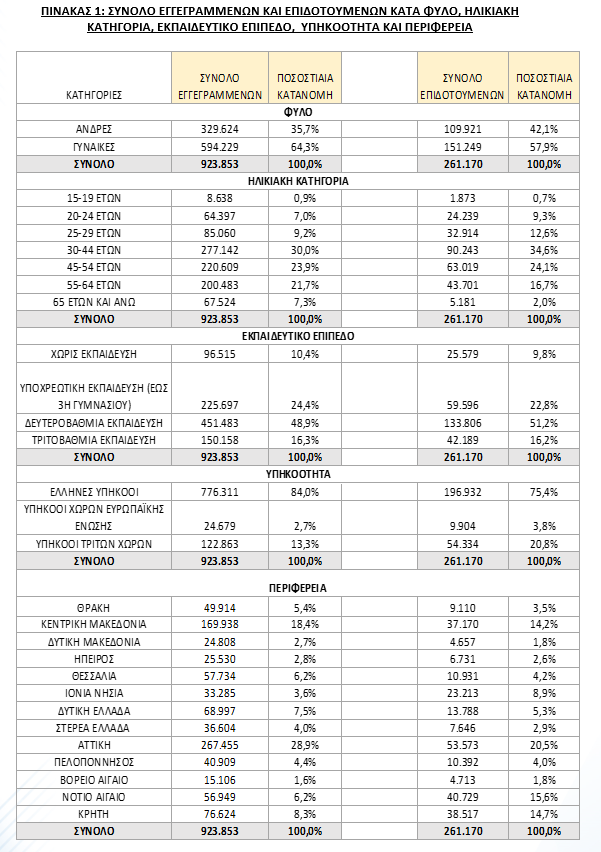 Μεταξύ των Περιφερειών της Χώρας η Περιφέρεια Αττικής και η Περιφέρεια Κεντρικής Μακεδονίας καταγράφουν τον μεγαλύτερο αριθμό εγγεγραμμένων ο οποίος ανέρχεται σε 267.455 άτομα (ποσοστό 28,9%) και 169.938 άτομα (ποσοστό 18,4%) αντίστοιχα.