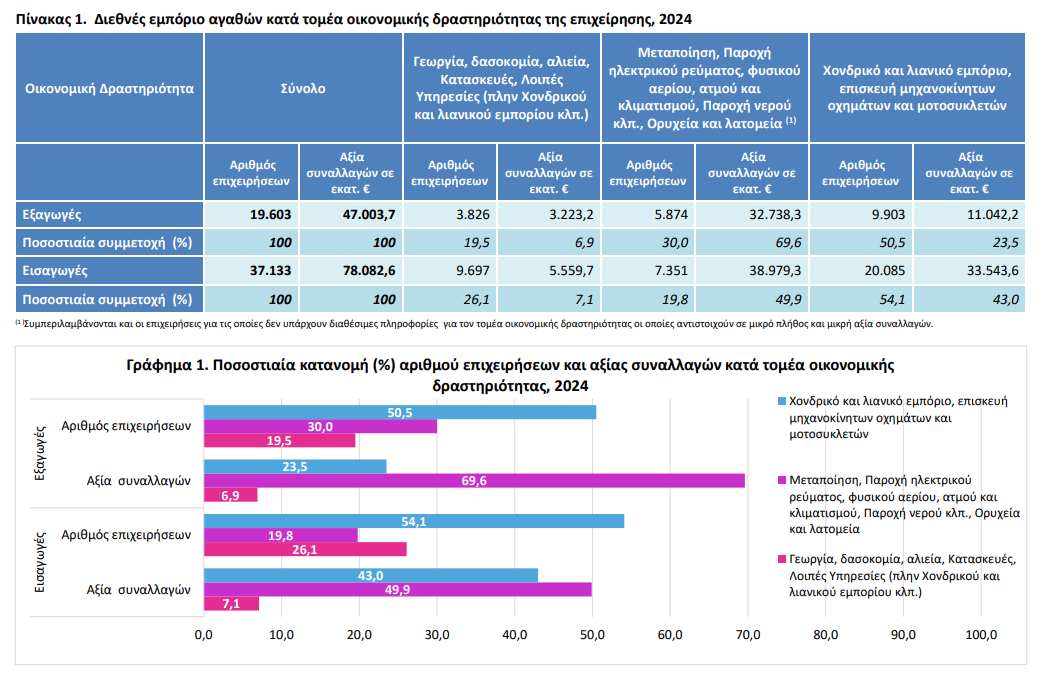 Τα στοιχεία των Στατιστικών Διεθνούς Εμπορίου Αγαθών κατά Επιχειρηματικά Χαρακτηριστικά ανακοίνωσε η Ελληνική Στατιστική Αρχή (ΕΛΣΤΑΤ), τα οποία παρουσιάζουν την αξία των εισαγωγών και εξαγωγών ανά τομέα οικονομικής δραστηριότητας των επιχειρήσεων, κατά τάξεις μεγέθους των επιχειρήσεων, κατά τύπο ιδιοκτησιακού ελέγχου, καθώς και τη γεωγραφική διασπορά και τη συγκέντρωση του εμπορίου για το έτος 2024.