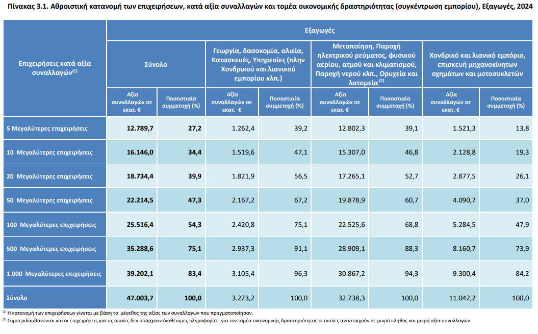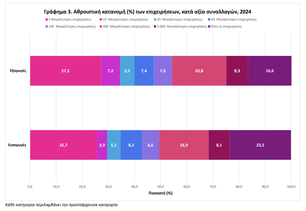 Από την ανάλυση της κατανομής των επιχειρήσεων με βάση το μέγεθος της αξίας των συναλλαγών που διενήργησαν, όσον αφορά στις εξαγωγές, το 27,2% της συνολικής αξίας των εξαγωγών πραγματοποιήθηκε από 5 συνολικά επιχειρήσεις, το 47,3% της συνολικής αξίας των εξαγωγών πραγματοποιήθηκε από 50 συνολικά επιχειρήσεις, το δε 83,4% πραγματοποιήθηκε από 1.000 συνολικά επιχειρήσεις (Πίνακας 3.1 – Γράφημα 3).