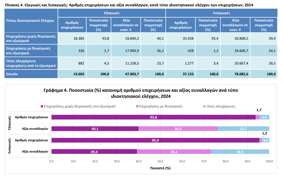 Όσον αφορά στον τύπο ιδιοκτησιακού ελέγχου των επιχειρήσεων που διενήργησαν εισαγωγές το 95,4% (35.428 επιχειρήσεις) του συνολικού αριθμού των επιχειρήσεων δεν έχουν θυγατρικές στο εξωτερικό (30.808,5 εκατ. €, 39,4% της συνολικής αξίας των εισαγωγών), το 1,2% (428 επιχειρήσεις) του συνολικού αριθμού των επιχειρήσεων που διενήργησαν εισαγωγές έχουν θυγατρικές στο εξωτερικό (26.606,7 εκατ. €, 34,1% της συνολικής αξίας των εισαγωγών), ενώ το 3,4% (1.277 επιχειρήσεις) του συνολικού αριθμού των επιχειρήσεων (20.667,4 εκατ. €, 26,5% της συνολικής αξίας των εισαγωγών) είναι ξένες ελεγχόμενες επιχειρήσεις από το εξωτερικό (Πίνακας 4 – Γράφημα 4).