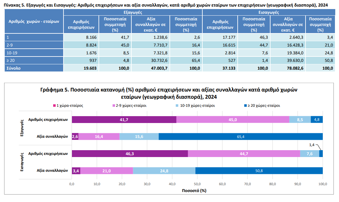 Από την ανάλυση των επιχειρήσεων με βάση τη γεωγραφική διασπορά των εισαγωγών, δηλαδή τον αριθμό χωρών εταίρων από τις οποίες οι επιχειρήσεις πραγματοποίησαν εισαγωγές, το 1,4% (527 επιχειρήσεις) του συνολικού αριθμού των επιχειρήσεων πραγματοποίησε εισαγωγές από περισσότερες από 20 χώρες – εταίρους (39.630,0 εκατ. €, 50,8% της συνολικής αξίας εισαγωγών), το 7,6% (2.814 επιχειρήσεις) πραγματοποίησε εισαγωγές από 10-19 χώρες – εταίρους (19.384,0 εκατ. €, 24,8% της συνολικής αξίας εισαγωγών), το 44,7% (16.615 επιχειρήσεις) πραγματοποίησε εισαγωγές από 2-9 χώρες – εταίρους (16.428,3 εκατ. €, 21,0% της συνολικής αξίας εισαγωγών) και το 46,3% (17.177 επιχειρήσεις) πραγματοποίησε εισαγωγές από 1 μόνο χώρα – εταίρο (2.640,3 εκατ. €, 3,4% της συνολικής αξίας εισαγωγών), (Πίνακας 5 – Γράφημα 5).