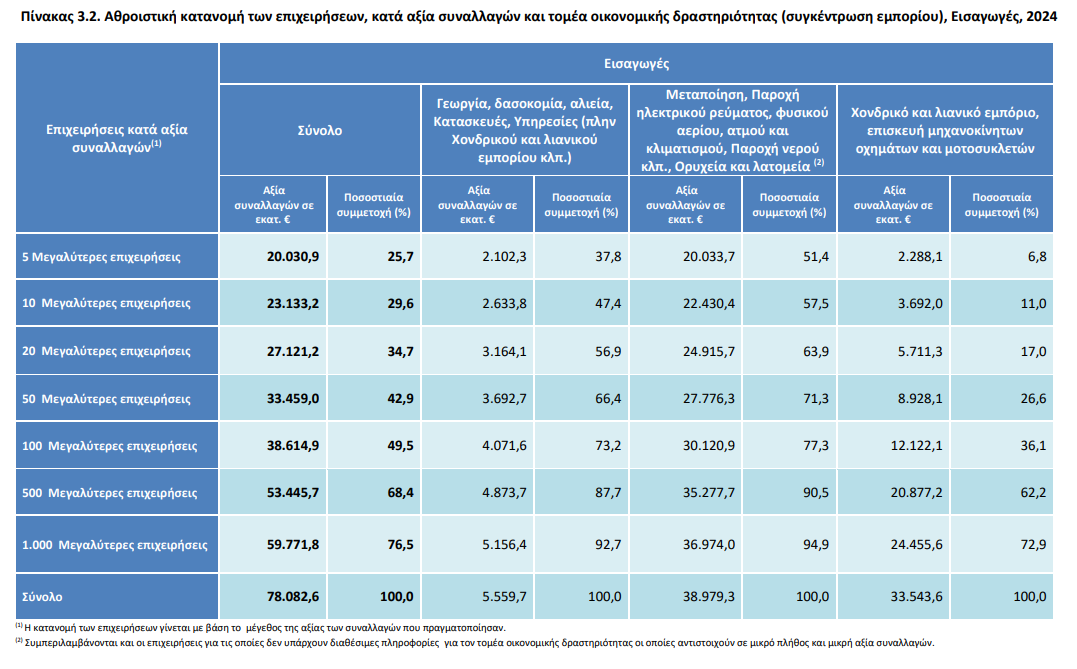 Από την ανάλυση της κατανομής των επιχειρήσεων με βάση το μέγεθος της αξίας των συναλλαγών που διενήργησαν, παρατηρείται ότι το 25,7% της συνολικής αξίας των εισαγωγών πραγματοποιήθηκε από 5 συνολικά επιχειρήσεις, το 49,5% της συνολικής αξίας των εισαγωγών πραγματοποιήθηκε από 100 συνολικά επιχειρήσεις, το δε 76,5% της συνολικής αξίας των εισαγωγών πραγματοποιήθηκε από 1.000 συνολικά επιχειρήσεις (Πίνακας 3.2 – Γράφημα 3).