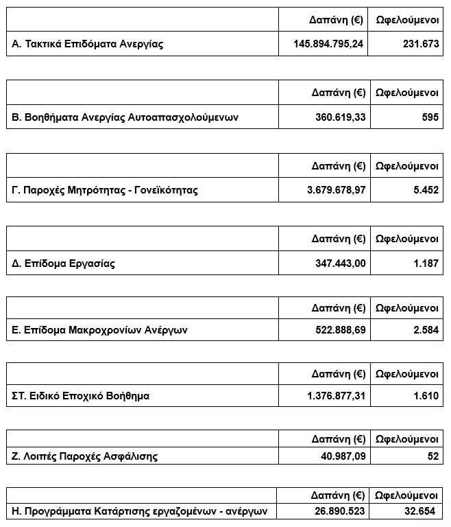 Παρουσιάζονται αναλυτικά οι συνολικές δαπάνες και ο αριθμός ωφελούμενων ανά κατηγορία παροχών καθώς και οι δαπάνες για τα ειδικά προγράμματα απασχόλησης οργανωμένες σε εννέα βασικές κατηγορίες.