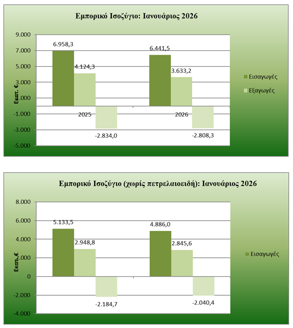 Οι εισαγωγές συρρικνώθηκαν και εκείνες τον Ιανουάριο του 2026 (-7,4% ή 516,8 εκ. €) και άγγιξαν τα 6,44 δισ. ευρώ έναντι 6,99 δισ. ευρώ κατά τον ίδιο μήνα του έτους 2025. Εξαιρουμένων των πετρελαιοειδών, οι εισαγωγές αγαθών διαμορφώθηκαν σε 4,89 δισ. ευρώ από 5,13 δισ. ευρώ, δηλαδή συρρικνώθηκαν κατά 247,5 εκ. ευρώ ή κατά -4,8%.