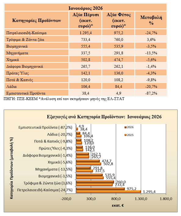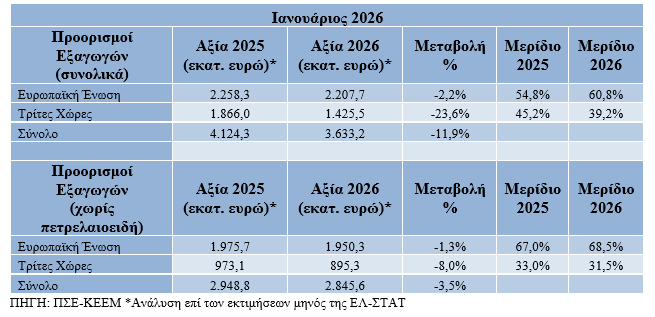 Σύμφωνα με ανάλυση του Πανελληνίου Συνδέσμου Εξαγωγέων και του Κέντρου Εξαγωγικών Ερευνών και Μελετών (ΚΕΕΜ), επί των προσωρινών στοιχείων της ΕΛΣΤΑΤ, μειώθηκαν σημαντικά οι εξαγωγές κατά το μήνα Ιανουάριο του 2026 καθώς περιορίστηκαν κατά 491,1 εκ. ευρώ ή κατά -11,9% και ανήλθαν μόλις σε 3,63 δισ. ευρώ έναντι 4,12 δισ. ευρώ κατά τον ίδιο μήνα του έτους 2025. Εξαιρουμένων των πετρελαιοειδών, έχουμε μείωση (-3,5%), με αποτέλεσμα οι εξαγωγές να αγγίξουν τα 2,85 δισ. ευρώ από 2,95 δισ. ευρώ, δηλαδή περιορίστηκαν κατά 103,2 εκατ. ευρώ.