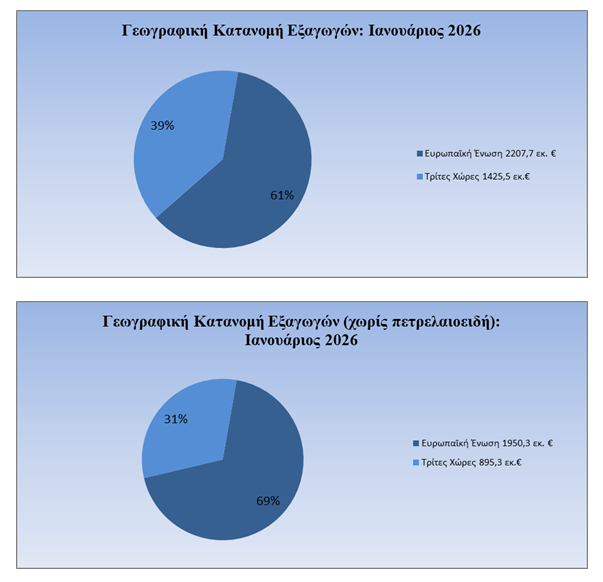 Όσον αφορά στην πορεία των εξαγωγών ανά γεωγραφικές περιοχές τον Ιανουάριο του 2026, παρατηρείται μικρή μείωση των αποστολών προς τις χώρες της Ε.Ε. (-2,2%) ενώ σημαντικά βαθύτερη είναι η μείωση προς τις Τρίτες Χώρες (-23,6%). Όταν, όμως, εξαιρεθούν τα πετρελαιοειδή η εικόνα βελτιώνεται, οι εξαγωγές προς τις Χώρες της ΕΕ καταγράφουν πτώση (-1,3%), ενώ οι εξαγωγές προς τις Τρίτες Χώρες (-8%), σε σχέση με τον αντίστοιχο περισυνό μήνα.