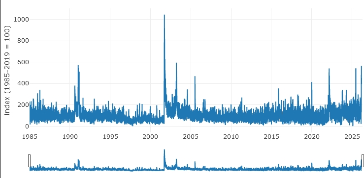 Ο Μάρτιος του 2026 έφερε μια μεγάλη ανατροπή στα δεδομένα για τον γεωπολιτικό κίνδυνο, καθώς η έναρξη των πολεμικών επιχειρήσεων ΗΠΑ και Ισραήλ κατά του Ιράν προκάλεσε την κατακόρυφη άνοδο του GPR Index. Όπως φαίνεται στο γράφημα, η τιμή του δείκτη (σημείο αναφοράς το 100 για την περίοδο 1985–2019) πλησίασε στο 400 και ήταν η υψηλότερη από τον Μάρτιο του 2003, όταν ξεσπούσε ο δεύτερος πόλεμος κατά του Ιράκ.