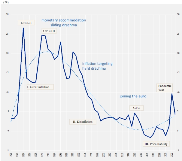 Όπως προκύπτει από τα στοιχεία για την εξέλιξη του πληθωρισμού από τη δεκαετία του '70 μέχρι και την ενεργειακή κρίση του 2022, η Ελλάδα μπήκε σε μια μακρά περιπέτεια με υψηλό πληθωρισμό μετά τα δύο σοκ της δεκαετίας του '70, την οποία σταδιακά άρχισε να ξεπερνά από τη δεκαετία του '90, για να φθάσουμε σε μια περίοδο χαμηλού και ελεγχόμενου πληθωρισμού μετά την είσοδο στην ευρωζώνη.