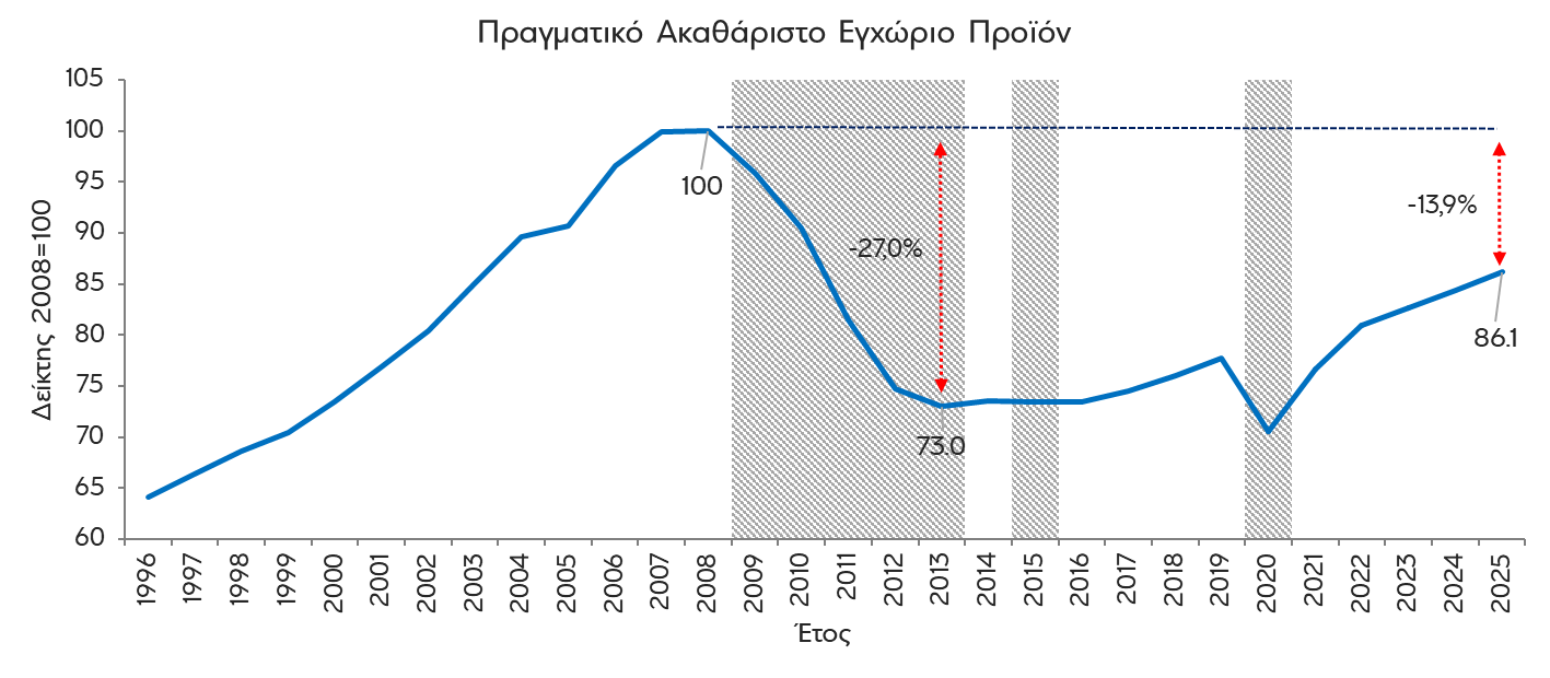 Η ελληνική οικονομία έχει ανακτήσει των 48,7% του απωλειών της κρίσης χρέους (σε όρους πραγματικού ΑΕΠ). Απαιτείται ενίσχυση της παραγωγικότητας για να διατηρηθεί η τρέχουσα αναπτυξιακή δυναμική