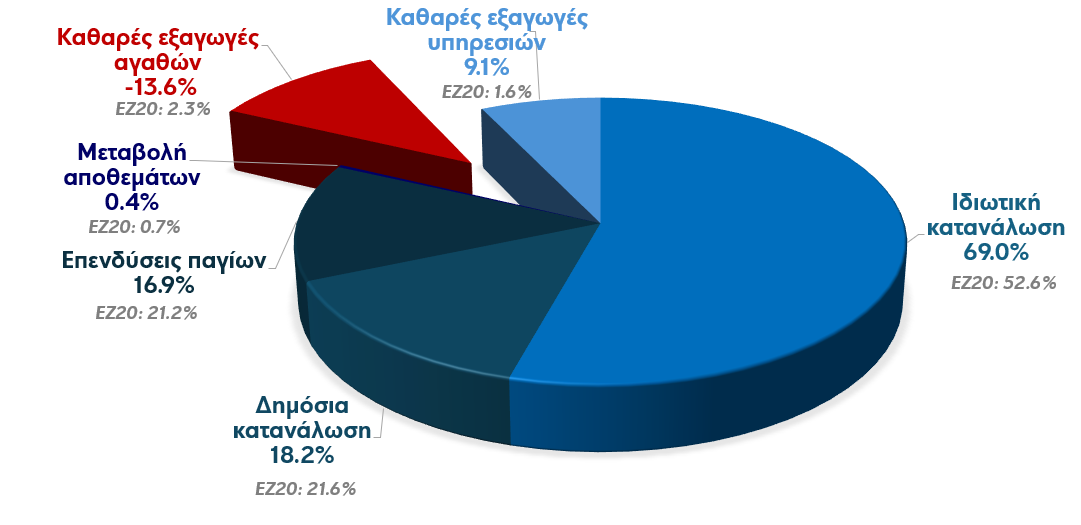 *Καθώς το ισοζύγιο αγαθών είναι ελλειμματικό, αρνητικοί ρυθμοί μεταβολής των καθαρών εξαγωγών αγαθών συνεπάγονται συρρίκνωση του ελλείμματος, με θετική συμβολή στο ρυθμό μεγέθυνσης.