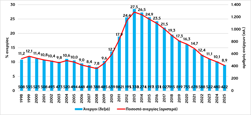 Σύμφωνα με τα στοιχεία της Έρευνας Εργατικού Δυναμικού της ΕΛΣΤΑΤ στο σύνολο του 2025 το μη εποχικά προσαρμοσμένο ποσοστό ανεργίας κατήλθε στο 8,9% από 10,1% το 2024, ενώ ο αριθμός των ανέργων περιορίστηκε κατά 57,8 χιλ. (στους 422,0 χιλ.) (Διάγραμμα 6). Παράλληλα, ο αριθμός των απασχολουμένων αυξήθηκε κατά 63,8 χιλ. (στους 4.339,7) χιλ., αλλά υπολείπεται κατά 270,8 χιλ. από το μέγιστο αριθμό τους το 2008 (4.610,5 χιλ.).
