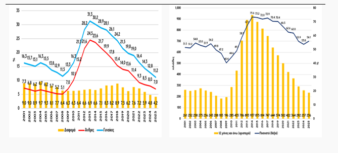 Στους άνδρες (60,6% το 2025 από 60,7% το 2024) παραμένει διαχρονικά υψηλότερο από το εθνικό ποσοστό. Εξάλλου, ο αριθμός των μακροχρόνια ανέργων βρίσκεται κάτω από τα επίπεδα των 300,0 χιλ. από το 2023, και το 2025 περιορίστηκε σε ετήσια βάση κατά 21,9 χιλ. στους 235,5 χιλ., αλλά το ποσοστό μακροχρόνιας ανεργίας αυξήθηκε στο 56,1% από 53,8% (Διάγραμμα 7-δεξιά).