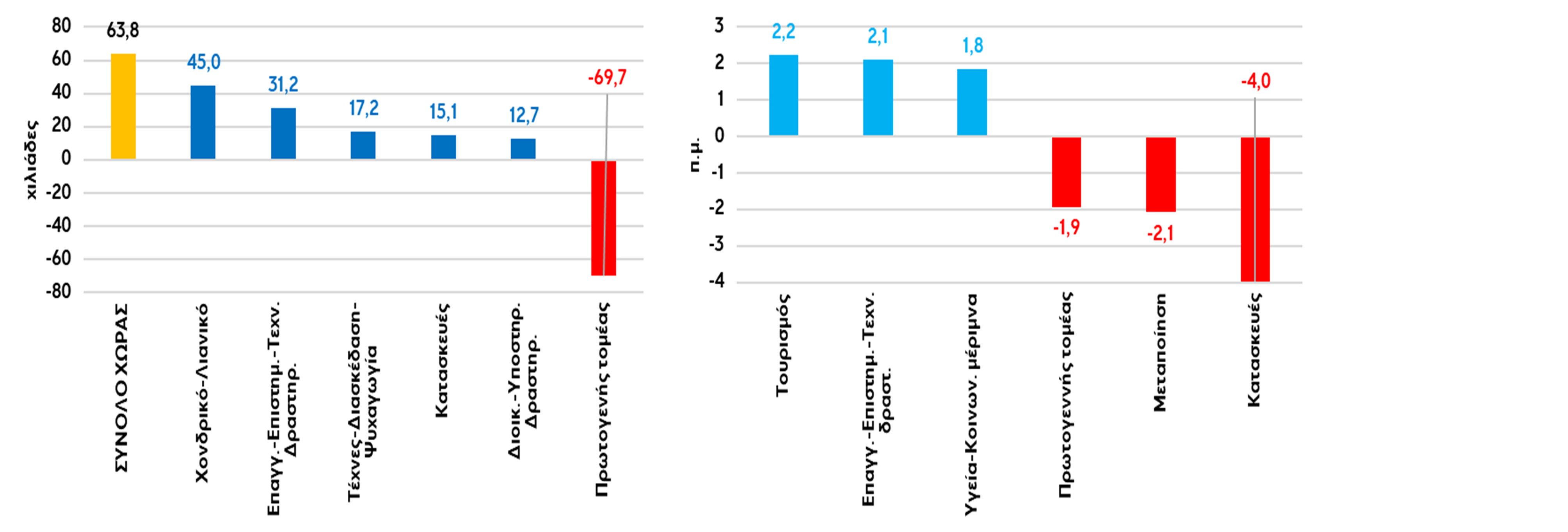 Η άνοδος της απασχόλησης προήλθε κυρίως από την άνοδό της στους κλάδους Χονδρικού-Λιανικού εμπορίου (+45,0 χιλ. στους 759,1 χιλ.), Επαγγελματικών-Επιστημονικών-Τεχνικών δραστηριοτήτων (+31,2 χιλ. στους 314,6 χιλ.), Τεχνών-Διασκέδασης-Ψυχαγωγίας (+17,2 χιλ. στους 72,8 χιλ.), Κατασκευών (+15,1 χιλ. στους 200,8 χιλ.) και Διοικητικών-Υποστηρικτικών δραστηριοτήτων (+12,7 χιλ. στους 113,2 χιλ.), παρά τη σημαντική μείωση της στον Πρωτογενή τομέα κατά 69,7 χιλ. (στους 399,0 χιλ.) (Διάγραμμα 8-αριστερά).