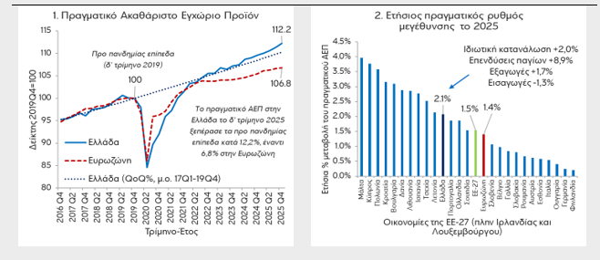 Συμπερασματικά, η αναπτυξιακή υπεραπόδοση της ελληνικής οικονομίας έναντι του μέσου όρου της Ευρωζώνης συνεχίστηκε και το 2025, έστω και ηπιότερα σε σχέση με προηγούμενα έτη. Για το 2026, η πολεμική σύρραξη στην ευρύτερη περιοχή απειλεί με στασιμοπληθωριστικές επιδράσεις, εφόσον επεκταθεί χωρικά και χρονικά.