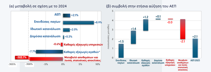 Για το σύνολο του έτους 2025, η ανάπτυξη στην Ελλάδα διατηρήθηκε στα ίδια επίπεδα με εκείνα των ετών 2024 και 2023, ήτοι στο 2,1%, καταγράφοντας υπεραπόδοση έναντι της Ευρωζώνης. Υπό το πρίσμα της ζήτησης, η μεγέθυνση της ελληνικής οικονομίας το 2025 βασίστηκε στην άνοδο των επενδύσεων παγίων, της ιδιωτικής κατανάλωσης και των εξαγωγών αγαθών, ενώ υπό το πρίσμα της προσφοράς βασίστηκε στην ενίσχυση της παραγωγής των κλάδων της βιομηχανίας, των κατασκευών και των χρηματοπιστωτικών και επαγγελματικών υπηρεσιών (βλ. την ανάλυση στις επόμενες παραγράφους σχετικά με τη συμβολή των συνιστωσών της δαπάνης και της παραγωγής στους εθνικούς λογαριασμούς του 2025).