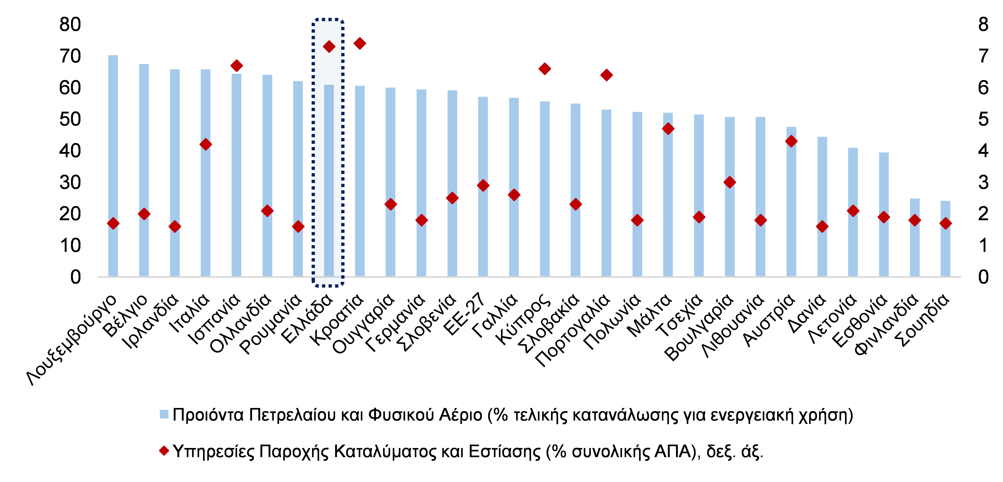 Ωστόσο, το γεγονός ότι η Ελλάδα είναι καθαρός εισαγωγέας ενέργειας, με σημαντική εξάρτηση από το πετρέλαιο και το φυσικό αέριο, την καθιστά ευάλωτη σε έντονες αυξήσεις των διεθνών τιμών ενέργειας. Συγκεκριμένα, το συνολικό μερίδιο του πετρελαίου, των παραγώγων αυτού[i] και του φυσικού αερίου στην τελική κατανάλωση ενέργειας (για ενεργειακή χρήση [ii]) ήταν 61% το 2024, από τα υψηλότερα στην Ε.Ε.