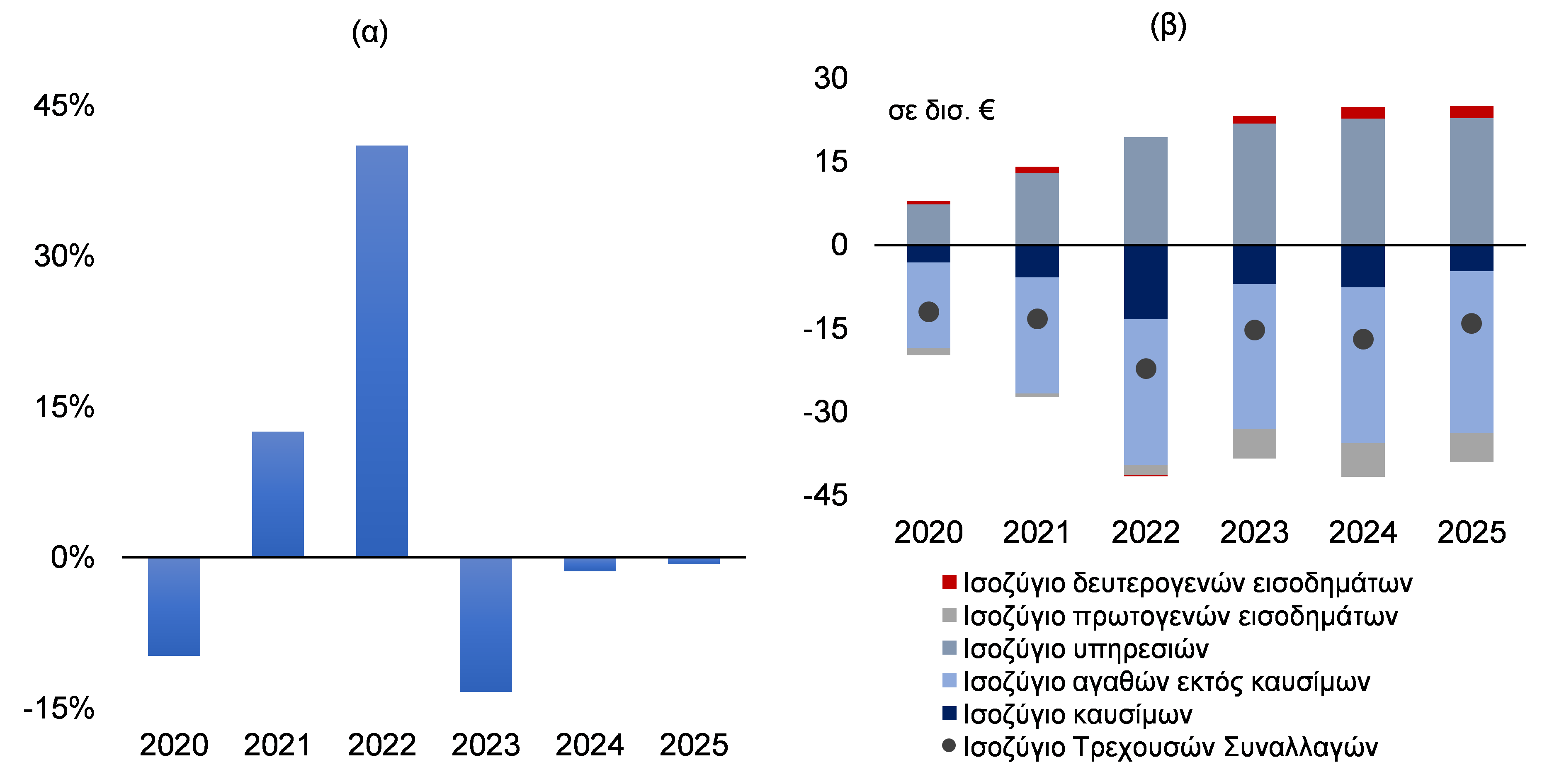 Ετήσιες μεταβολές του ΕνΔΤΚ-Ενέργεια (α) και εξέλιξη του Ισοζυγίου Τρεχουσών Συναλλαγών (β)