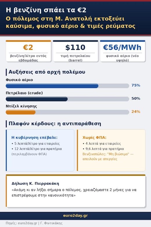 Σε όλο και πιο αχαρτογράφητα νερά κινείται ο πόλεμος στη Μέση Ανατολή, με το λογαριασμό για την οικονομία να μεγαλώνει, τη βενζίνη να ετοιμάζεται να σπάσει το φράγμα των 2 ευρώ και ορατές τις πρώτες ανατιμήσεις στην εφοδιαστική αλυσίδα, ξεκινώντας από τα οικοδομικά υλικά.