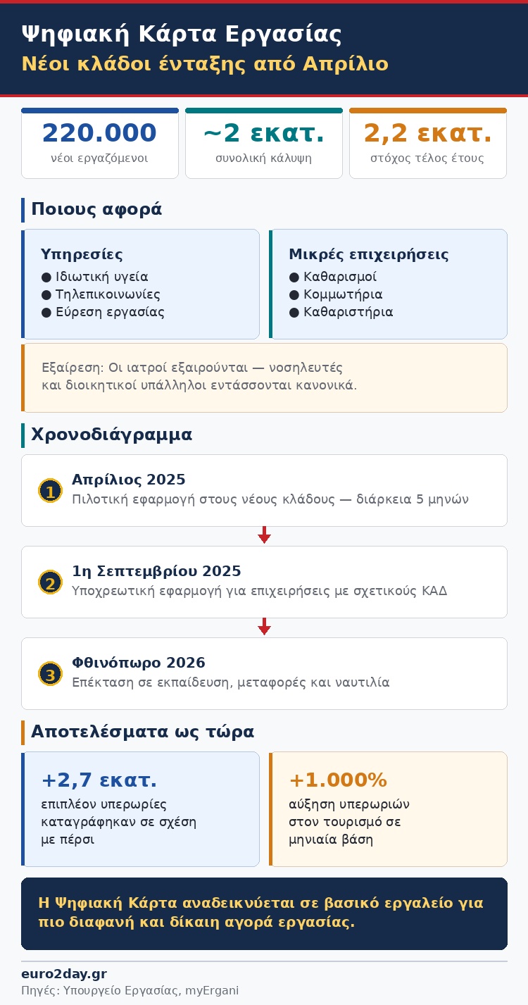 Από το Φθινόπωρο του 2026 και μετά, στην επόμενη φάση επέκτασης, αναμένεται να ενταχθούν κλάδοι όπως η εκπαίδευση, οι μεταφορές και η ναυτιλία, ενισχύοντας περαιτέρω τον μηχανισμό ελέγχου της εργασίας.