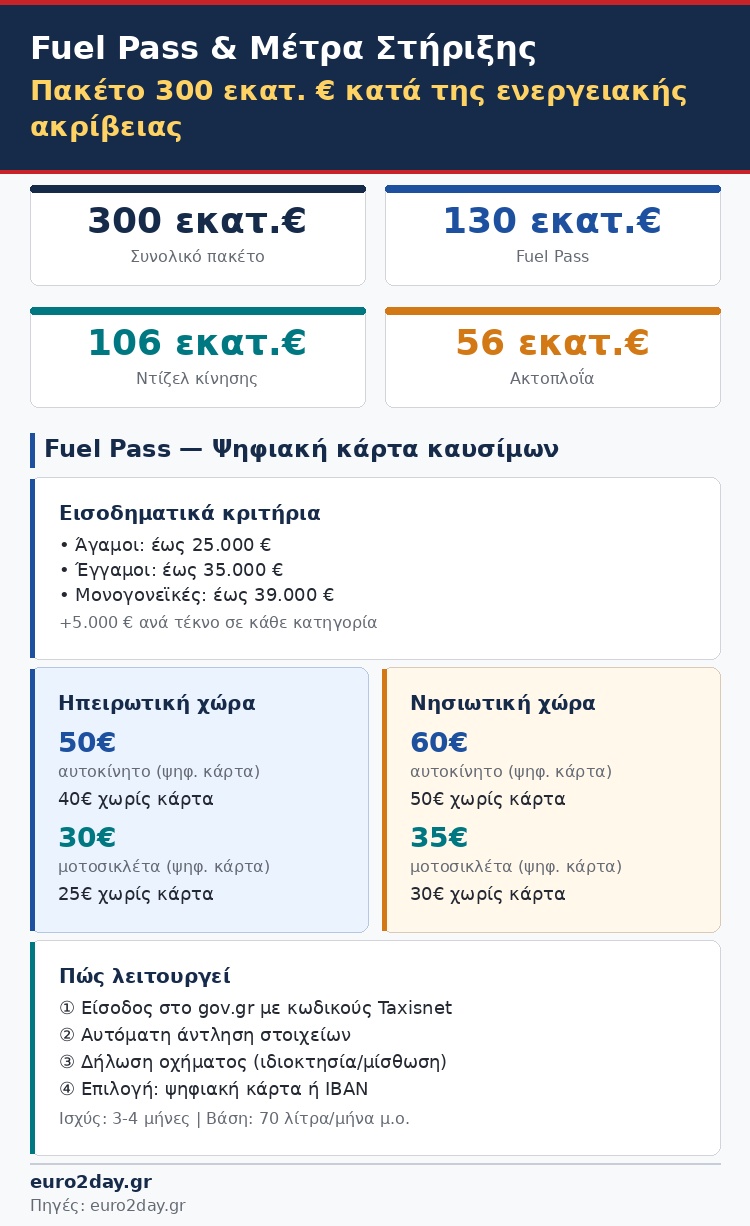 Στην εποχή των «pass» επιστρέφει από την 1η Απριλίου- και τουλάχιστον για ένα δίμηνο- η χώρα, καθώς η νέα ενεργειακή κρίση που πυροδότησε ο πόλεμος στη Μέση Ανατολή, ανάγκασε την κυβέρνηση να ανακοινώσει το πρώτο «πακέτο» μέτρων στήριξης των πολιτών, προκειμένου να συγκρατηθεί το κόστος των καυσίμων το οποίο επηρεάζει καθοριστικά το σύνολο της οικονομίας με απρόβλεπτες ακόμα επιπτώσεις στις τιμές προϊόντων και υπηρεσιών, τον πληθωρισμό και την ανάπτυξη.