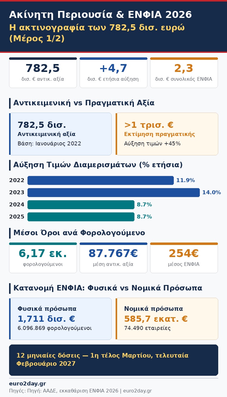 Η «ακτινογραφία» της αξίας της ακίνητης περιουσίας των Ελλήνων φορολογουμένων, προκύπτει από τα στατιστικά στοιχεία της Ανεξάρτητης Αρχής Δημοσίων Εσόδων (ΑΑΔΕ) μετά την εκκαθάριση του ΕΝΦΙΑ 2026, ο συνολικός λογαριασμός του οποίου ανέρχεται σε 2,3 δισ. ευρώ (ίδιος περίπου με πέρυσι) και ο οποίος θα πληρωθεί σε 12 ισόποσες μηνιαίες δόσεις με την πρώτη στο τέλος Μαρτίου και την τελευταία τον Φεβρουάριο του 2027.