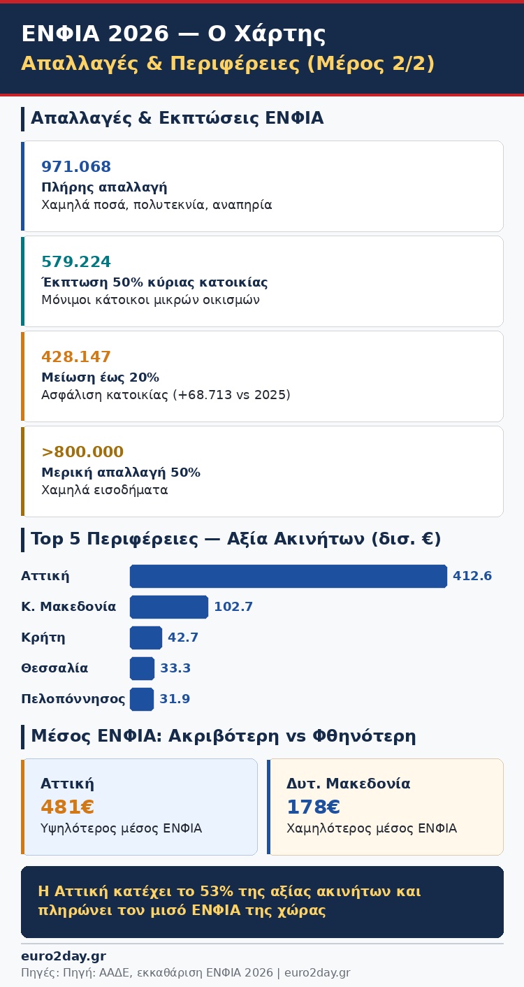 - Ακόμα: 12.759 νομικά πρόσωπα απαλλάχθηκαν επίσης πλήρως από τον ΕΝΦΙΑ του 2026, λόγω χαμηλών καταλογισθέντων ποσών ή άλλων ειδικών απαλλαγών που ίσχυσαν.