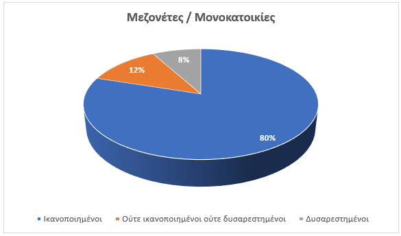 Όσον αφορά τα επίπεδα ικανοποίησης, αυτά εμφανίζονται υψηλότερα σε όσους κατοικούν σε μεζονέτες και μονοκατοικίες (80%), σε σύγκριση με εκείνους που ζουν σε διαμερίσματα (73%). Ιδιαίτερα στους ιδιοκτήτες μονοκατοικιών, το ποσοστό ικανοποίησης φτάνει το 82%, στοιχείο που υποδηλώνει ότι όσο μεγαλύτερο και πιο ευρύχωρο είναι ένα σπίτι, τόσο αυξάνεται η αίσθηση ικανοποίησης των κατοίκων του.