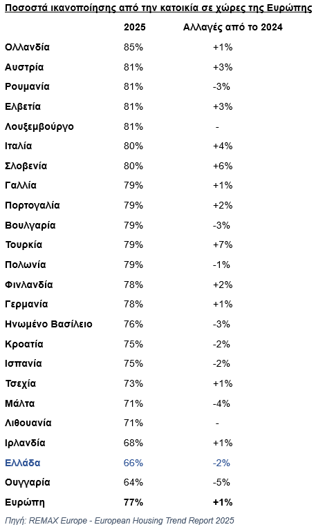 Σύμφωνα με στοιχεία της πανευρωπαϊκής έρευνας European Housing Trend Report για το 2025, που πραγματοποίησε το κτηματομεσιτικό δίκτυο REMAX Ευρώπης, το 66% των Ελλήνων δηλώνει ικανοποιημένο με τις συνθήκες στέγασης. Το ποσοστό αυτό είναι μειωμένο κατά 2 ποσοστιαίες μονάδες σε σύγκριση με το 2024.