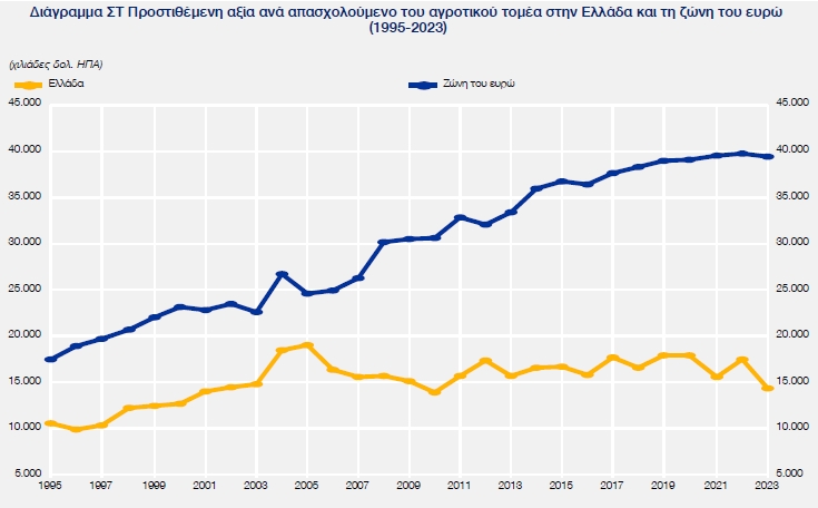 Το ειδικό θέμα που αφιερώνει στα προβλήματα του αγροτικού τομέα η Τράπεζα της Ελλάδος στην Έκθεση του Διοικητή για το 2025 καταγράφει με αδιαμφισβήτητα οικονομικά στοιχεία πώς ο ελληνικός αγροτικός τομέας μετά το 2025 είδε την παραγωγικότητά του να πέφτει σε τέλμα, την ώρα που ο αγροτικός τομέας της ευρωζώνης σχεδόν διπλασίαζε τη δική του παραγωγικότητα, κυρίως χάρη στην εφαρμογή νέων τεχνολογιών παραγωγής.