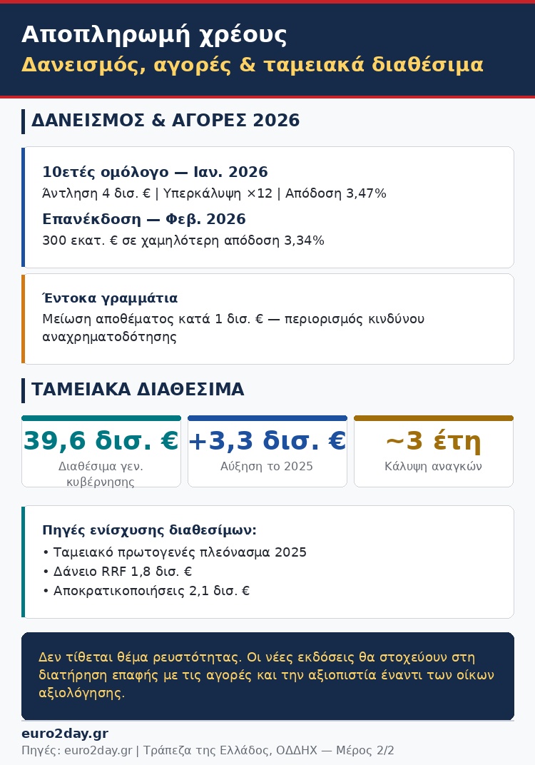 Η αύξηση των ταμειακών διαθεσίμων επετεύχθη παρά την αποδέσμευση ποσού ύψους 5,3 δισ. ευρώ τον Δεκέμβριο του 2025 στο πλαίσιο της πρόωρης αποπληρωμής του υπολειπόμενου ποσού των διακρατικών δανείων του πρώτου προγράμματος χρηματοδοτικής στήριξης (Greek Loan Facility – GLF), συνολικού ύψους 31,6 δισ. ευρώ, έως το 2031 – δηλαδή 10 έτη νωρίτερα από την αρχικά προβλεπόμενη λήξη τους, με πολύπλευρες θετικές επιδράσεις».