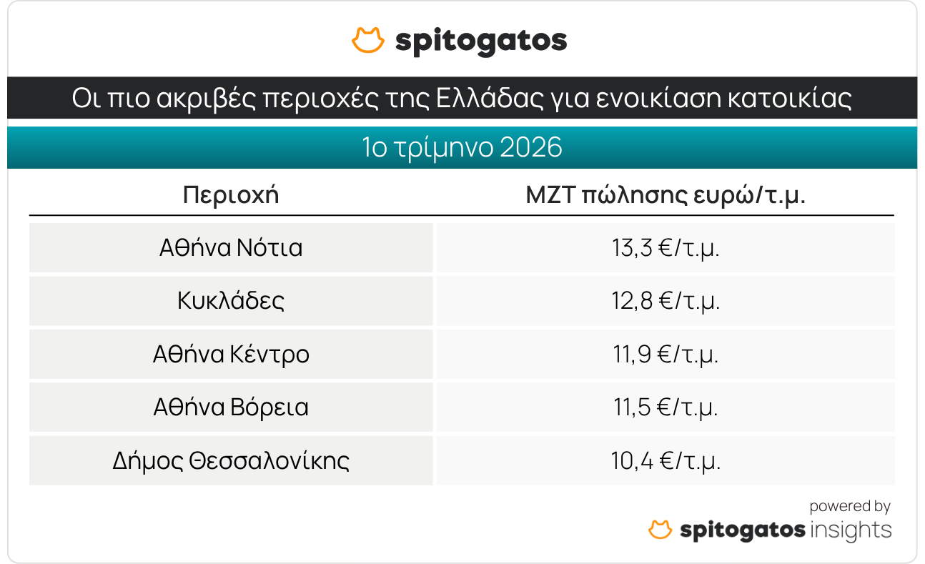 Το Spitogatos Insights εξέτασε την εξέλιξη των ΜΖΤ πώλησης και ενοικίασης κατοικιών στην Αττική κατά το 1ο τρίμηνο του 2026. Σύμφωνα με τα πρόσφατα στοιχεία, τα Νότια Προάστια σχεδόν μονοπωλούν το top 5 των πιο ακριβών περιοχών της Αττικής, με τη Βουλιαγμένη να βρίσκεται στην κορυφή με ΜΖΤ 7.333 ευρώ/τ.μ., ενώ ακολουθούν η Βούλα, το Ελληνικό, η Γλυφάδα και το Ιστορικό Κέντρο της Αθήνας, όπως φαίνεται στον παρακάτω πίνακα.