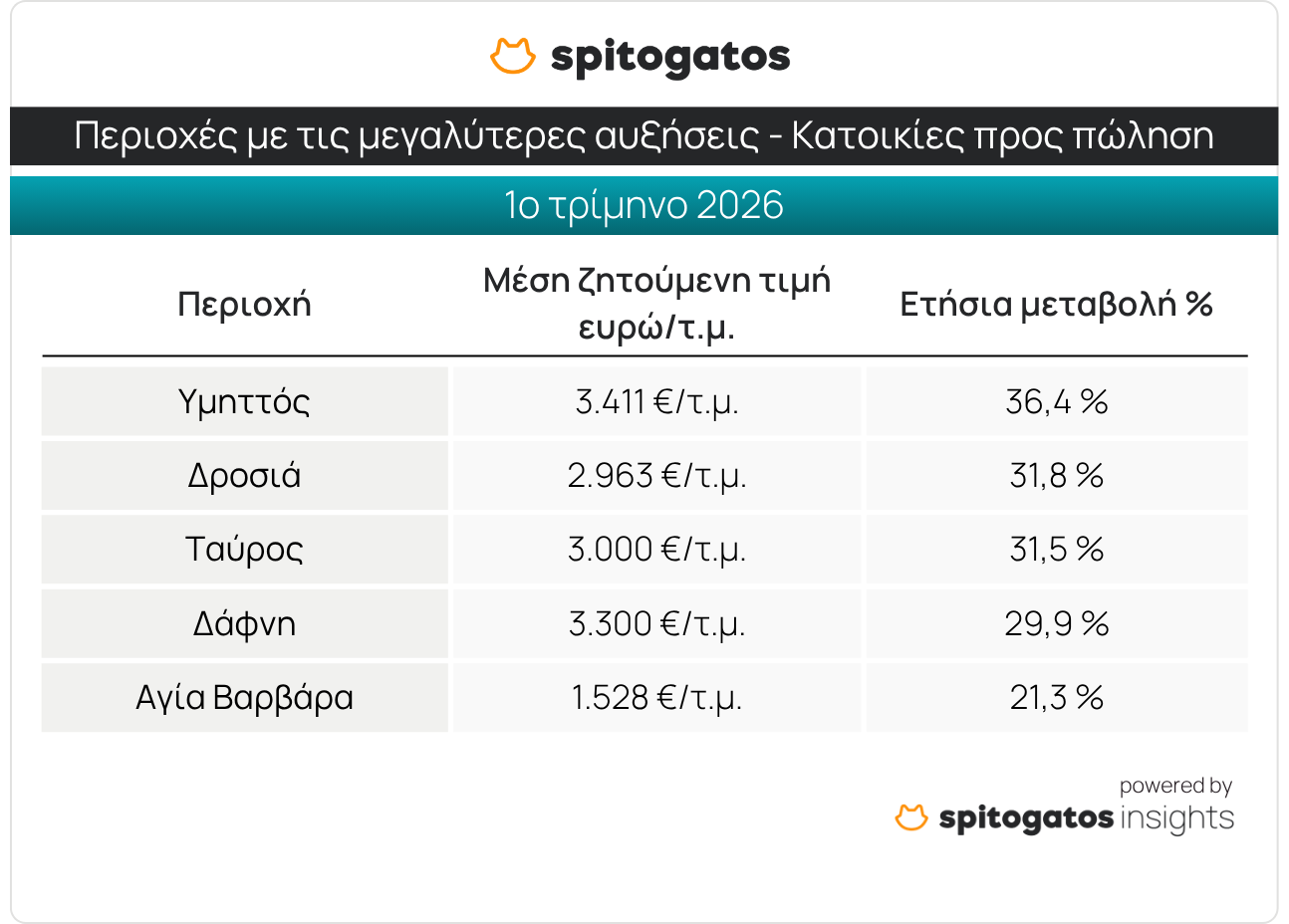 Οι περιοχές που ξεχώρισαν κατά το 1ο τρίμηνο του 2026 για τις σημαντικές αυξήσεις που σημείωσαν στη ΜΖΤ πώλησης κατοικίας σε σχέση με το αντίστοιχο τρίμηνο του 2025 είναι η περιοχή του Υμηττού, ενώ ακολουθούν η Δροσιά, ο Ταύρος, η Δάφνη και η Αγία Βαρβάρα.