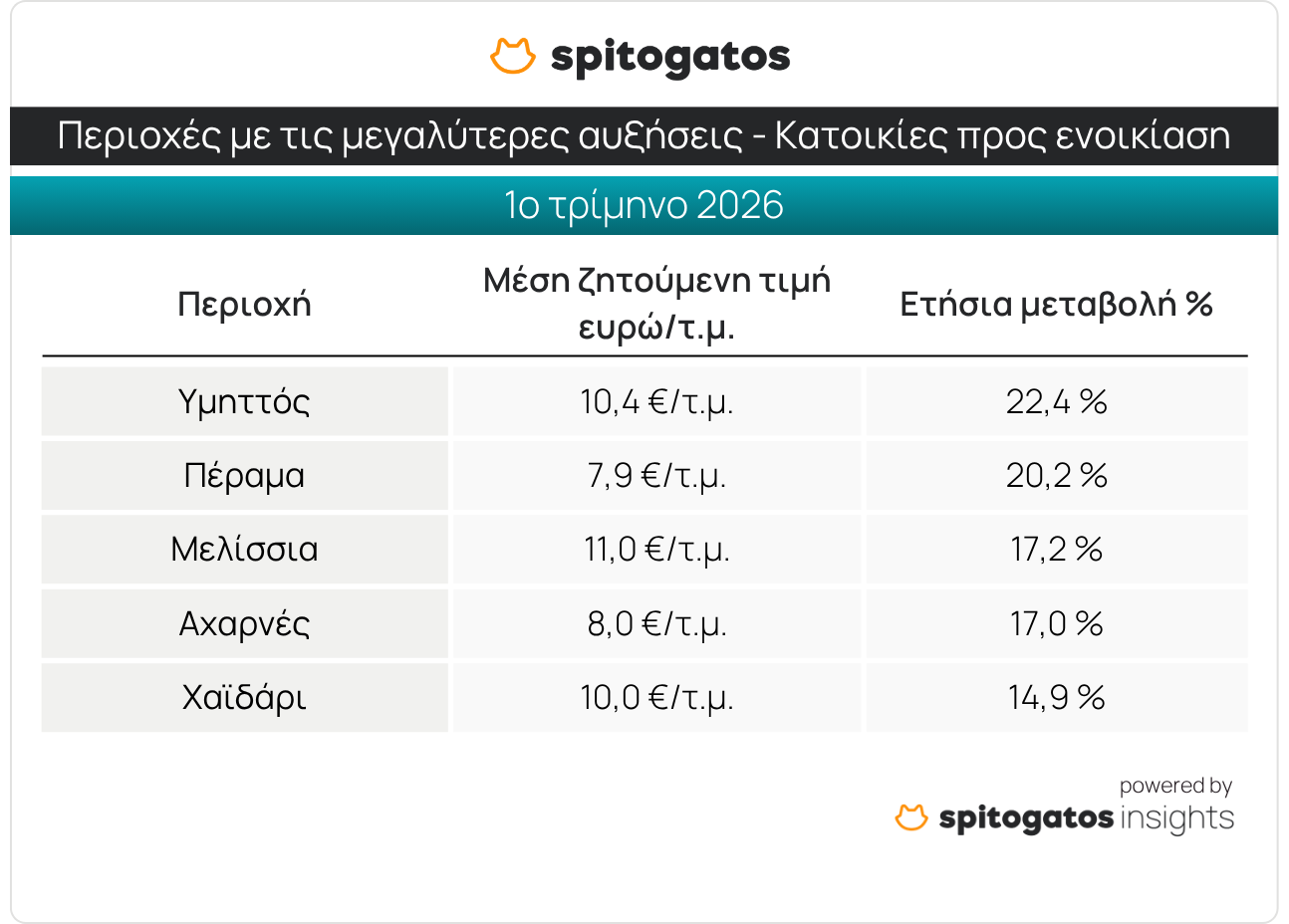 Στο κομμάτι της ενοικίασης, οι περιοχές που αναδεικνύονται με ετήσιες αυξήσεις ηπιότερες σε σχέση με την πώληση, είναι: ο Υμηττός, το Πέραμα, τα Μελίσσια, οι Αχαρνές και το Χαϊδάρι.