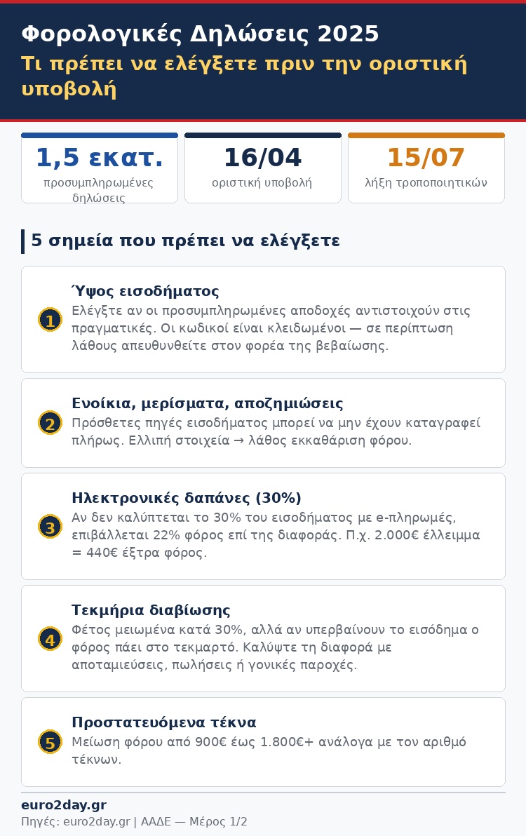 Ένα ακόμη κρίσιμο σημείο αφορά στις ηλεκτρονικές δαπάνες που έχουν πραγματοποιηθεί το προηγούμενο φορολογικό έτος καθώς η μη κάλυψη του απαιτούμενου ποσοστού με ηλεκτρονικά μέσα πληρωμής μπορεί να αυξήσει τον λογαριασμό της επιβάρυνσης, γεγονός που καθιστά αναγκαίο τον έλεγχο των σχετικών στοιχείων και την επιβεβαίωση ότι αποτυπώνονται σωστά στη δήλωση.