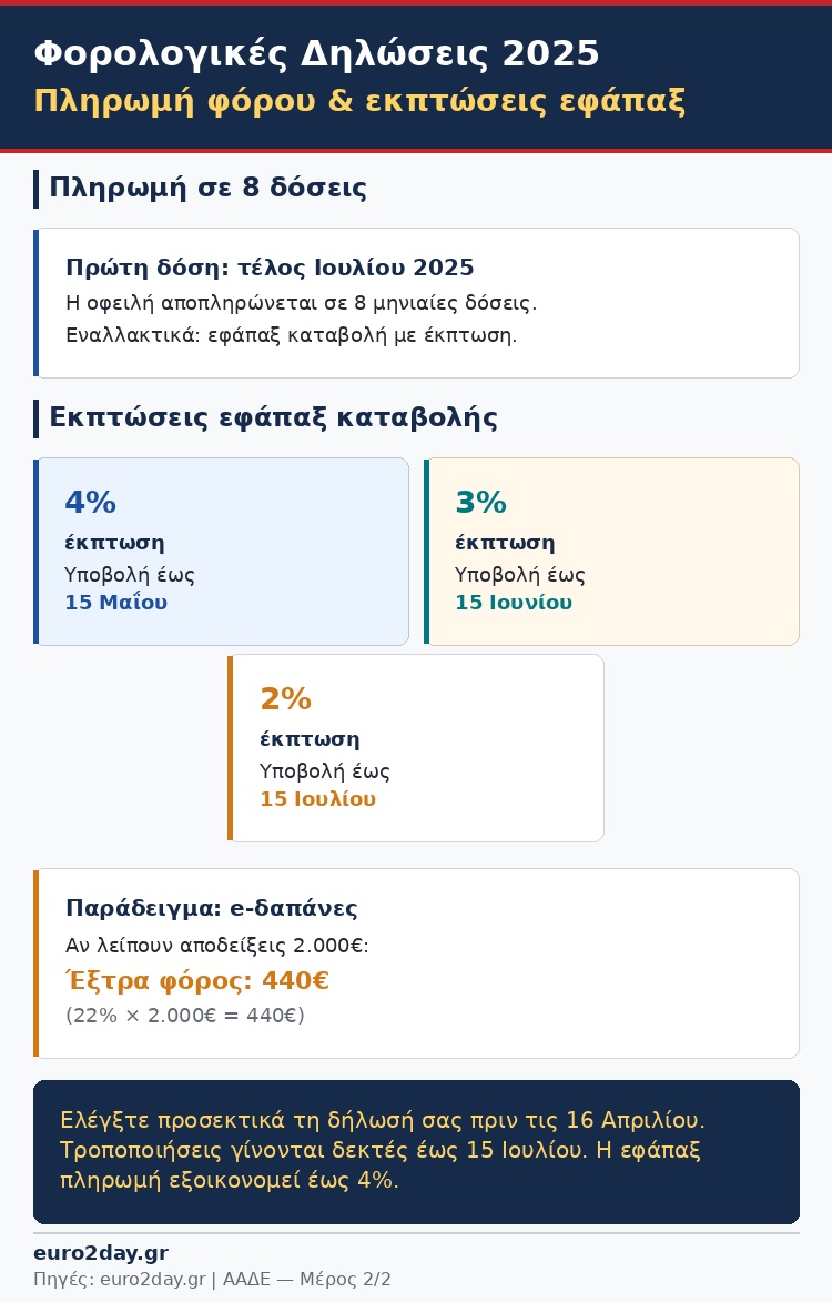 Σε περίπτωση εφάπαξ καταβολής το ποσοστό της έκπτωσης ανέρχεται σε 4% εάν η υποβολή της φορολογικής δήλωσης γίνει έως τις 15 Μαΐου σε 3% εάν η υποβολή της φορολογικής δήλωσης γίνει μέχρι τις 15 Ιουνίου και σε 2% εάν η υποβολή της φορολογικής δήλωσης γίνει μέχρι τις 15 Ιουλίου.
