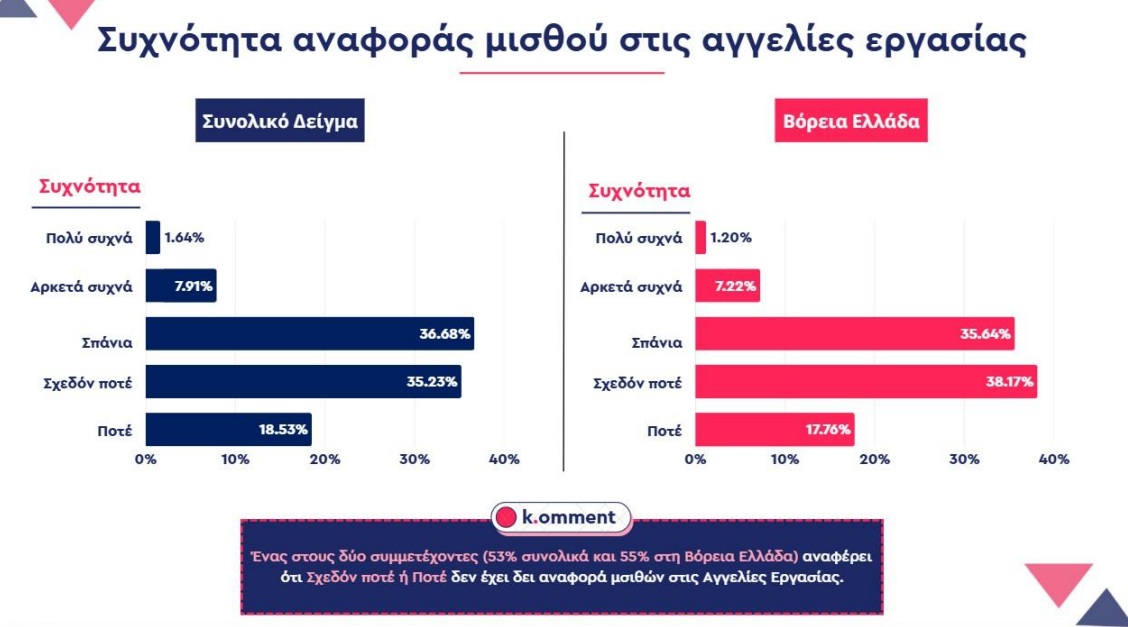 Οι έρευνες στηρίζεται σε απαντήσεις υποψήφιων ή εργαζόμενων τόσο από την γενιά των Millenials, όσο και της Gen Z και δηλώνουν ότι σε ποσοστό 53% «σχεδόν ποτέ ή ποτέ» δεν έχουν διαπιστώσει αναφορά μισθών στις αγγελίες εργασίας.