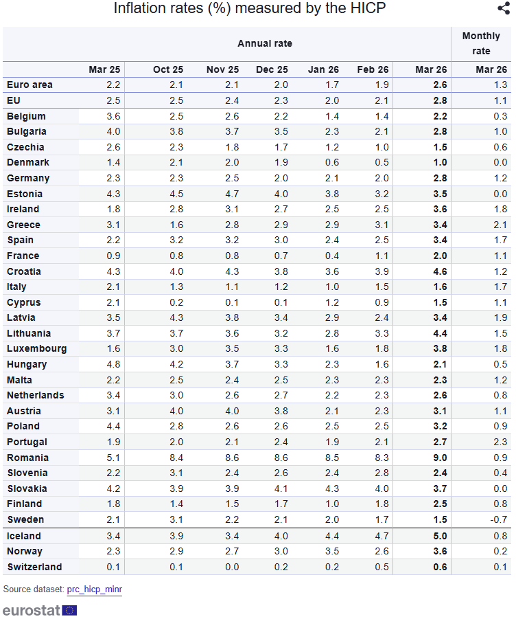 Ο ετήσιος πληθωρισμός στην Ευρωζώνη αναθεωρήθηκε υψηλότερα -στο 2,6% τον Μάρτιο, το υψηλότερο επίπεδο από τον Ιούλιο του 2024, έναντι προκαταρκτικής εκτίμησης για 2,5% και από 1,9% τον Φεβρουάριο.