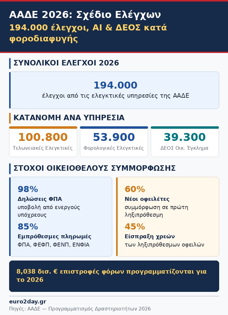 Με 194.000 ελέγχους από τις φορολογικές και τις τελωνειακές ελεγκτικές υπηρεσίες και με αιχμή το ΔΕΟΣ το οποίο θα δράσει και στο ερευνητικό πεδίο, θα επιχειρήσει η Ανεξάρτητη Αρχή Δημοσίων Εσόδων (ΑΑΔΕ) να περιορίσει περαιτέρω τη φοροδιαφυγή, το λαθρεμπόριο και το οικονομικό έγκλημα το 2026.