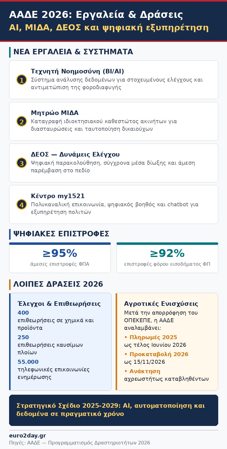Παράλληλα, η ΑΑΔΕ δίνει προτεραιότητα στην ενίσχυση της οικειοθελούς συμμόρφωσης μέσω προσυμπλήρωσης δηλώσεων, επικοινωνιακών δράσεων και ψηφιοποίησης διαδικασιών.