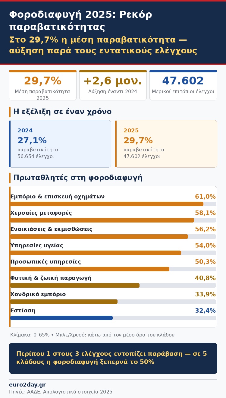 Το 2025 το μέσο ποσοστό παραβατικότητας διαμορφώθηκε σε 29,7%, τουλάχιστον 2,5 μονάδες υψηλότερα από το 2024 (ήταν 27,1%).