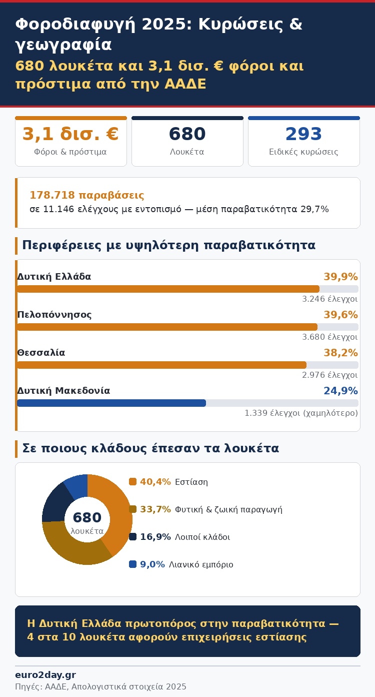 Στην περιφέρεια Δυτικής Ελλάδας εμφανίζεται το υψηλότερο ποσοστό εντοπισθείσας παραβατικότητας (39,9%) σε 3.246 ελέγχους και ακολουθούν η περιφέρεια Πελοποννήσου στην οποία πραγματοποιήθηκαν 3.680 έλεγχοι και εντοπίστηκαν παραβάσεις στο 39,6% αυτών και η περιφέρεια Θεσσαλίας με το ποσοστό εντοπισθείσας παραβατικότητας να ανέρχεται σε 38,2% σε σύνολο 2.976 ελέγχων.