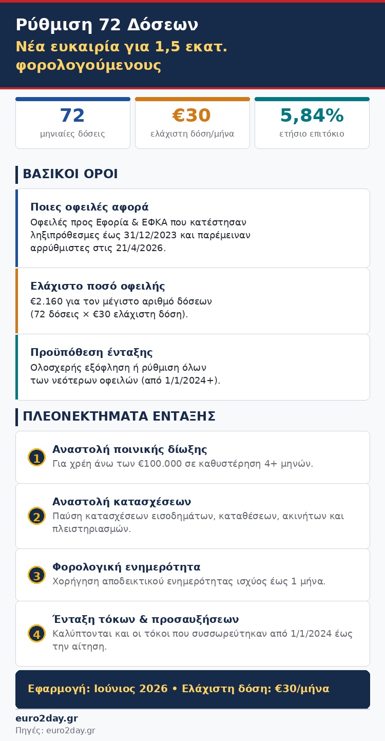 Μια ακόμα ευκαιρία, προκειμένου να ρυθμίσουν παλαιά τους χρέη στην Εφορία και τα Ασφαλιστικά Ταμεία, έχουν περισσότεροι από 1,5 εκατομμύριο φορολογούμενοι (φυσικά και νομικά πρόσωπα), με τη νέα ρύθμιση των 72 δόσεων που ανακοίνωσε η κυβέρνηση στο πλαίσιο της νέας δέσμης μέτρων για την ενίσχυση των ευάλωτων οικονομικά πολιτών (οικογενειών με παιδιά, συνταξιούχων και μικρομεσαίων).