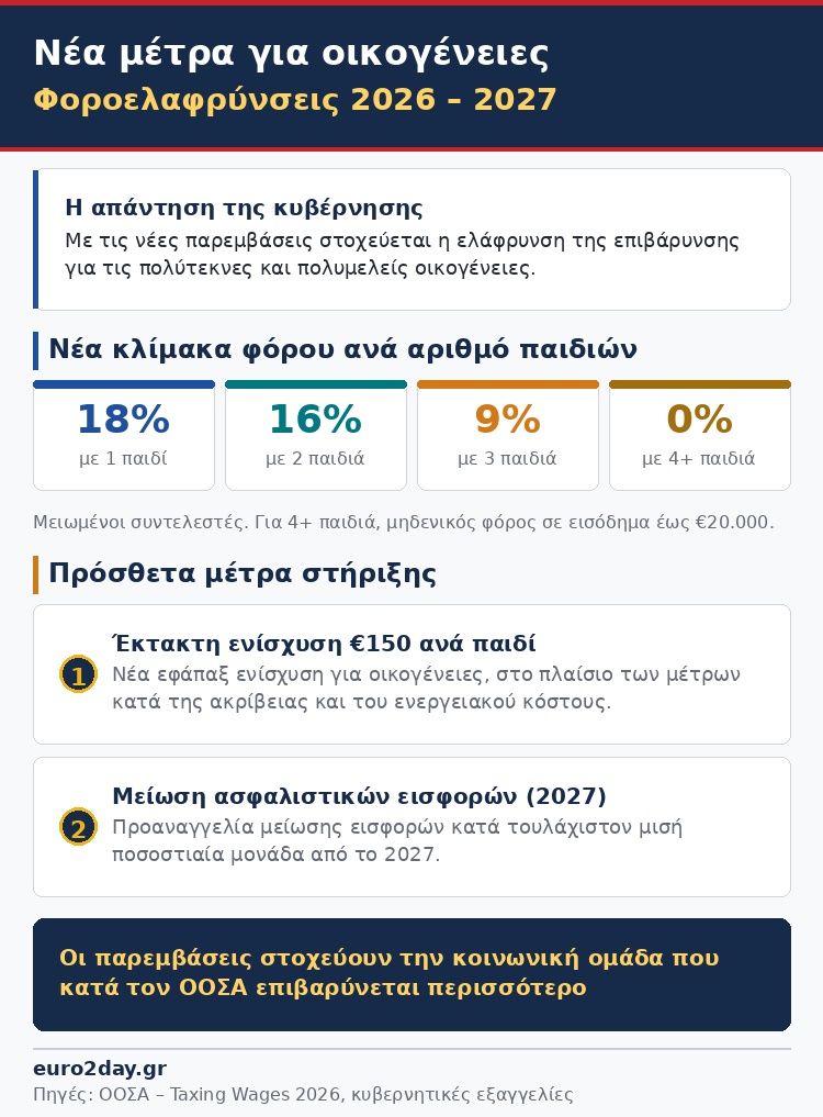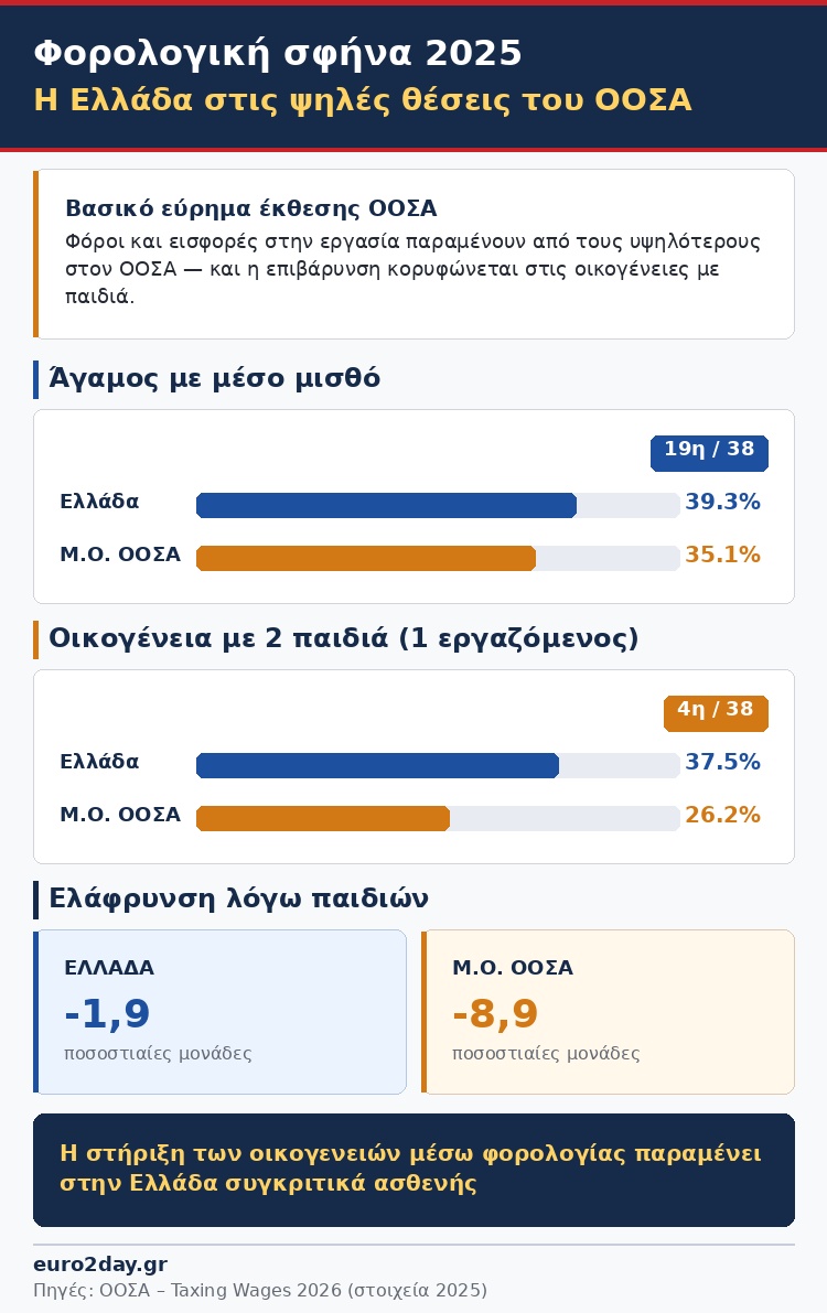Παρά το γεγονός ότι τα περισσότερα φορολογικά συστήματα προβλέπουν ελαφρύνσεις για οικογένειες μέσω επιδομάτων και φορολογικών διατάξεων, στην ελληνική περίπτωση η μείωση της επιβάρυνσης λόγω παιδιών περιορίζεται σε μόλις 1,9 ποσοστιαίες μονάδες, όταν ο μέσος όρος του ΟΟΣΑ φτάνει τις 8,9 μονάδες.